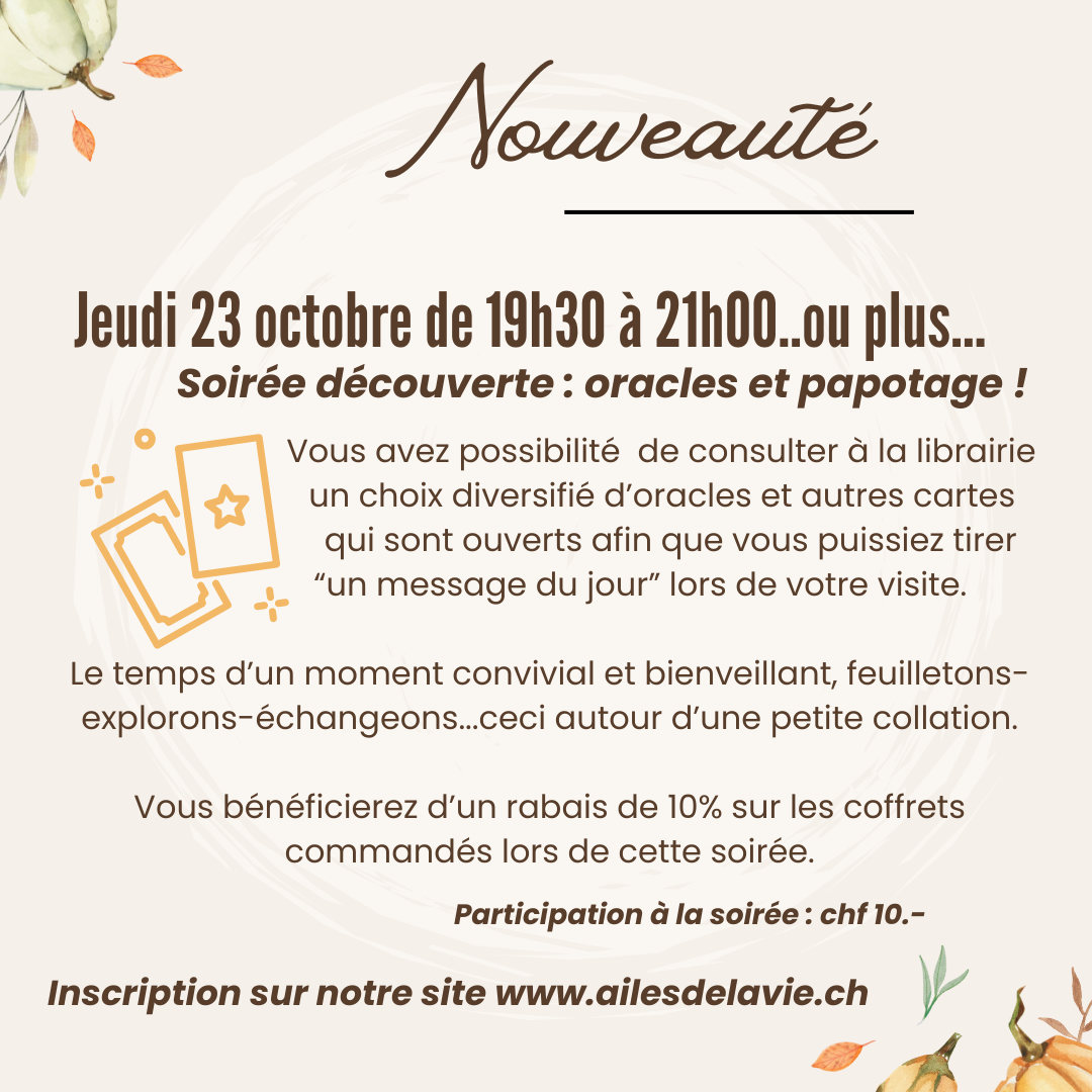 Fondée en 2006 et reprise en 2018 par Corinne Droz (-Jolliet), la librairie vous propose des livres et cartes oracles pour vous accompagner sur votre cheminement personnel de manière douce et légère. Vous y trouverez également de nombreuses sources d'inspiration et d'idées cadeaux. Votre parenthèse bien-être est nichée au coeur de la Gruyère, à Riaz (à côté de Bulle)...